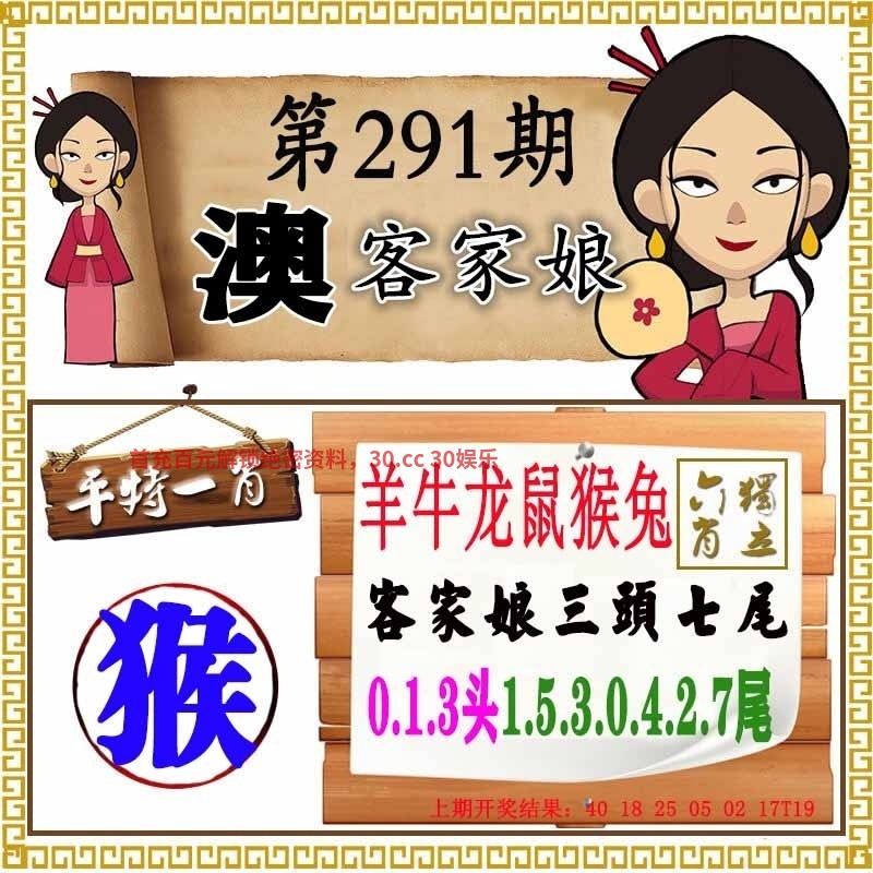 291期:客家娘心水 291期:【客家娘平特一肖】猴猴猴 291期:【客家娘三头七尾】301头-3204157尾 |